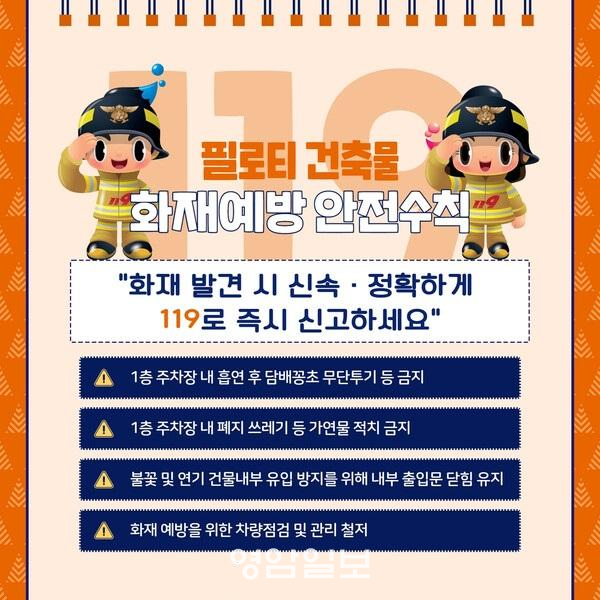 ÇÊ·ÎÆ¼ ±¸Á¶ °ÇÃ๰ÀÇ Æ¯¼º»ó ÈÀç ¹ß»ý ½Ã ´ëÇǰ¡ ´Ê¾îÁú °æ¿ì ÇÇÇØ°¡ ±Þ°ÝÈ÷ È®´ëµÉ ¼ö ÀÖÀ¸¹Ç·Î, ¾ÈÀü ¼öÄ¢ Áؼö¿Í ÇÔ²² ÈÀç ¹ß°ß ½Ã ½Å¼ÓÇÏ°Ô 119¿¡ ½Å°íÇÏ´Â °ÍÀÌ Áß¿äÇÏ´Ù. ÁֹεéÀº Æò¼Ò ÈÀç ¿¹¹æ¿¡ ´ëÇÑ °ü½ÉÀ» °¡Áö°í, ÁÖÂ÷Àå ¹× °ø¿ë °ø°£ °ü¸®¿¡ öÀú¸¦ ±âÇØ¾ß ÇÑ´Ù.