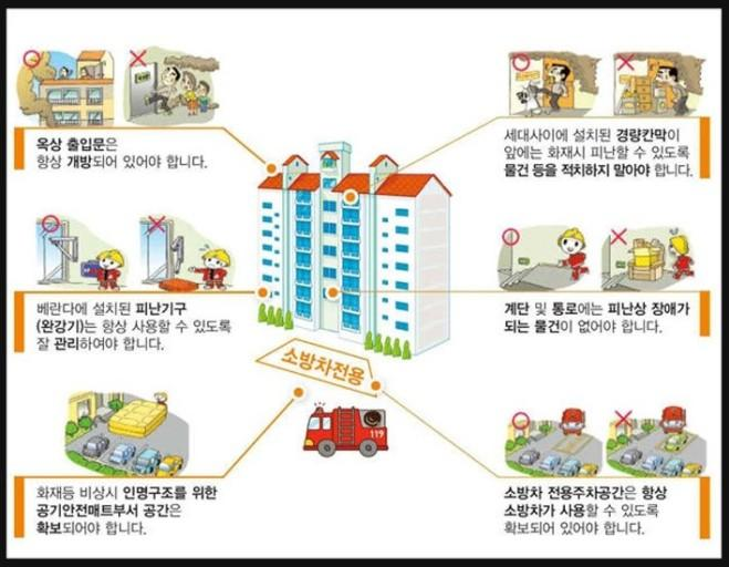 ¾ÆÆÄÆ® ÈÀ縦 ¿¹¹æÇϱâ À§ÇØ ¡â¿Á»ó ÃâÀÔ¹®Àº Ç×»ó °³¹æÇÏ¿© ´ëÇǷθ¦ È®º¸Çϰí, ¡â¼¼´ë ³» ¼³Ä¡µÈ °æ·®Ä¸·ÀÌ ¾Õ¿¡´Â ¹°°ÇÀ» ÀûÄ¡ÇÏÁö ¾Ê¾Æ¾ß ÇÑ´Ù. ¶ÇÇÑ, ¡âº£¶õ´Ù¿¡ ¼³Ä¡µÈ ¿Ï°±â´Â »ç¿ë °¡´ÉÇϵµ·Ï À¯Áö¡¤°ü¸®ÇØ¾ß Çϸç, ¡â°è´Ü ¹× º¹µµ¿¡´Â ÇdzÀ» ¹æÇØÇÏ´Â Àå¾Ö¹°À» µÎÁö ¾Ê¾Æ¾ß ÇÑ´Ù.