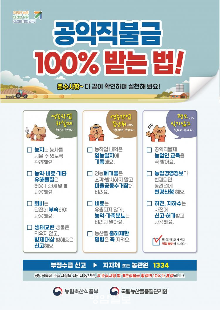 ±âº»Çü °øÀÍÁ÷ºÒÁ¦´Â ³ó¾÷․³óÃÌÀÇ °øÀÍÀû ±â´ÉÀ» ÁõÁøÇÏ¸é¼ ³ó¾÷¿¡ Á¾»çÇÏ´Â ³ó¾÷ÀÎÀÇ ¼Òµæ¾ÈÁ¤À» À§ÇØ Á÷ºÒ±ÝÀ» Áö¿øÇÏ´Â Á¦µµ·Î, Á÷ºÒ±ÝÀ» 100% ¹Þ±â À§Çؼ´Â ¹ý·É¿¡¼ Á¤ÇÑ 16°¡Áö Áؼö»çÇ×À» ¸ðµÎ ½ÇÃµÇØ¾ß ÇÑ´Ù.
