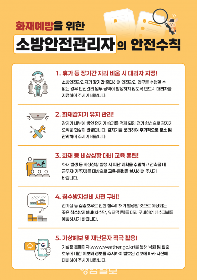 ÁÖ¿ä ¾È³»»çÇ×Àº ¡ã¼Ò¹æ¾ÈÀü°ü¸®ÀÚ Àå±â ºÎÀç ½Ã ´ë¸®ÀÚ ÁöÁ¤ ¡ãÈÀç°¨Áö±â Á¤±â û¼Ò ¹× À¯Áö°ü¸® ¡ãÈÀ硤ºñ»ó »óȲ ´ëºñ Çdz°èȹ ¼ö¸³ ¹× ±³À°ÈÆ·Ã ½Ç½Ã ¡ãÀü±â½Ç µî ħ¼ö¿ì·Á ½Ã¼³¿¡ ´ëÇÑ ¹æÁö½Ã¼³ »çÀü ±¸ºñ ¡ã±â»óƯº¸ ¹× Àç³¹®ÀÚ È°¿ë µî ÃÑ 5°¡Áö Ç׸ñÀ¸·Î ±¸¼ºµÅ ÀÖ´Ù.