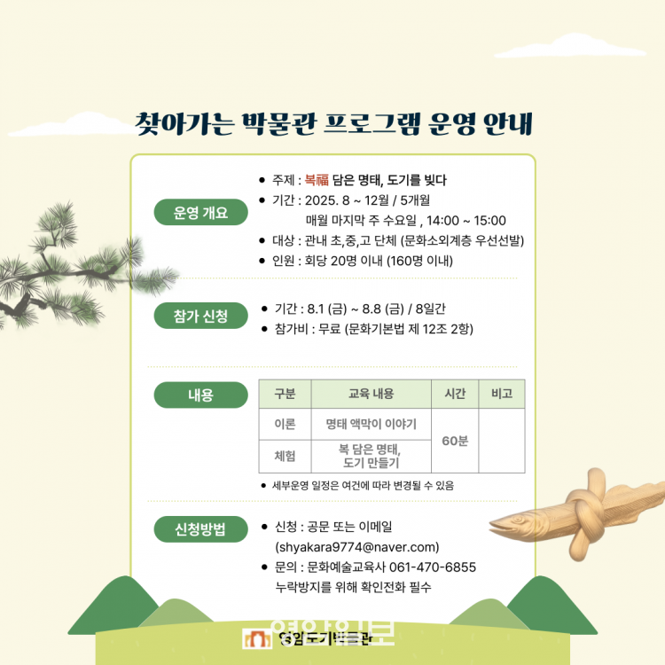 ÇÁ·Î±×·¥Àº ¡ã¡®¸íÅ ¾×¸·ÀÌ À̾߱⡯ À̷б³À° ¡ã¡®º¹ ´ãÀº ¸íÅÂ, µµ±â¸¦ ºú´Ù¡¯ °ø¿¹ üÇèÀ¸·Î ±¸¼ºµÅ ÀÖ´Ù. Âü°¡ÀÚµéÀº µµ±âÁ¶°¢°ú ģȯ°æ ¼ÒÀçÀÎ Á¦½º¸ð³ªÀÌÆ®·Î ÀüÅë ¾×¸·ÀÌ ¸íÅ ¸¸µé±â¿¡ µµÀüÇÑ´Ù.
