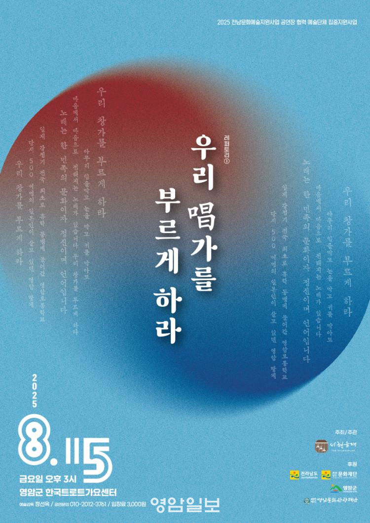À̹ø °ø¿¬Àº 2025³â Àü³²¹®È¿¹¼úÁö¿ø»ç¾÷ °ø¿¬Àå Çù·Â ¿¹¼ú´Üü Áö¿ø »ç¾÷ÀÇ Çϳª·Î ¸¶·ÃµÅ ¡®´õÇöÀ½ÀçÀÇ ·¹ÆÛÅ丮¨ç¡¯ °ø¿¬À¸·Î ÁøÇàµÇ°í, 32¸íÀÇ ÁÖ¹ÎÂü¿©·Î ÀÌ·ïÁø´Ù.