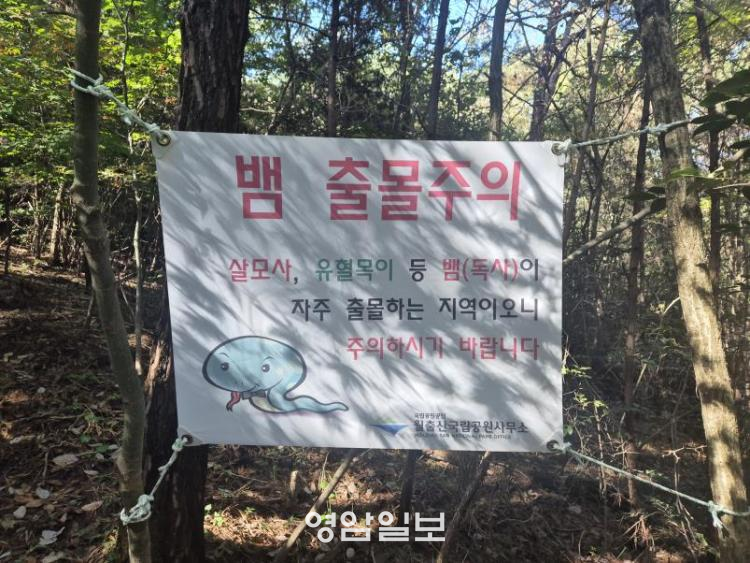 ¹éÃæ¿ ¿ùÃâ»ê±¹¸³°ø¿ø ޹æ½Ã¼³°úÀåÀº ¡°°¡À»Ã¶ »êÇà ½Ã Å½¹æ·Î¿¡¼ ¹úÁýÀ̳ª ¹ìÀ» ¹ß°ßÇßÀ» °æ¿ì °¡±îÀÌ Á¢±ÙÇϰųª °Çµå¸®Áö ¸»°í ¾ÈÀüÇÑ Àå¼Ò·Î À̵¿ ÈÄ ¿ùÃâ»ê±¹¸³°ø¿ø»ç¹«¼Ò(061-470-5210) ¶Ç´Â 119¿¡ ½Å°íÇØ ÁÙ °Í¡±À» ´çºÎÇß´Ù.