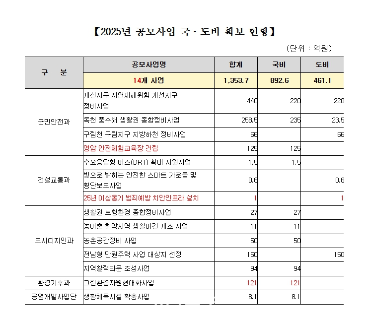 ¾ÈÀü°Ç¼³È¯°æ±¹Àº 2025³â ÇÑ ÇØ¿¡ °ø¸ð»ç¾÷ 14°Ç¿¡ ¼±Á¤µÅ ÃÑ»ç¾÷ºñ 1353.7¾ï ¿øÀ» È®º¸Çß´Ù. ÀÌ °¡¿îµ¥ ±¹ºñ 892.6¾ï ¿ø, µµºñ 461.1¾ï ¿øÀÌ Æ÷ÇԵŠÀÖ´Ù. ÀçÁ¤ ¿©°ÇÀÌ ½±Áö ¾ÊÀº ³óÃÌ ±º´ÜÀ§ ÁöÀÚü¿¡¼ ¿ÜºÎ Àç¿øÀ» Àû±ØÀûÀ¸·Î È®º¸ÇØ ±º¹Î »îÀ» ¹Ù²Ù´Â ±â¹ÝÀ» ³ÐÇô °¡°í ÀÖ´Ù´Â Á¡Àº Å« Àǹ̸¦ ÁØ´Ù.