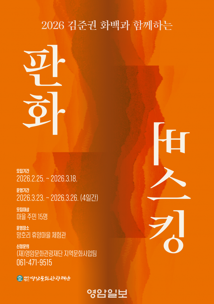 Âü°¡½ÅûÀº 3¿ù 20ÀϱîÁö °¡´ÉÇϸç, (Àç)¿µ¾Ï¹®È°ü±¤Àç´Ü Áö¿ª¹®È»ç¾÷ÆÀ(061-471-9516)À» ÅëÇØ Á¢¼öÇÒ ¼ö ÀÖ´Ù.