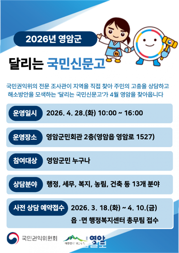 À̹ø ±¹¹Î½Å¹®°í´Â 4¿ù 28ÀÏ ¿ÀÀü 10½ÃºÎÅÍ ¿ÀÈÄ 4½Ã±îÁö ¿µ¾Ï±º¹Îȸ°ü¿¡¼ ¿¸°´Ù. ±¹¹Î±ÇÀÍÀ§¿øÈ¸ Àü¹® Á¶»ç°üÀÌ Á÷Á¢ ÇöÀåÀ» ã¾Æ ÇàÁ¤¡¤º¹Áö»Ó ¾Æ´Ï¶ó »ýȰ¹ý·ü, ¼¹Î±ÝÀ¶, ¼ÒºñÀÚ ÇÇÇØ±¸Á¦ µî ´Ù¾çÇÑ ºÐ¾ßÀÇ ¹Î¿øÀ» »ó´ãÇÑ´Ù.