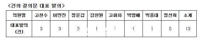 Á¶·Ê¾ÈÀº 52°ÇÀÌ ¹ßÀǵǾú´Âµ¥ °íÈÀÚ ÀÇ¿øÀÌ 12°ÇÀ¸·Î °¡Àå ¸¹Àº Á¶·Ê¾ÈÀ» ¹ßÀÇÇÏ¿´°í ±× µÚ¸¦ À̾î À̸¸Áø ÀÇ¿ø°ú Á¤¿î°© ÀÇ¿øÀÌ 8°ÇÀÇ Á¶·Ê¾ÈÀ» ¹ßÀÇÇÏ¿´´Ù°í ¹àÇû´Ù. Á¶·Ê¾È ¹ßÀÇ´Â Áö¹æÀÇȸÀÇ Áß¿äÇÑ ÀÔ¹ý ±â´ÉÀ¸·Î¼ ÁֹεéÀÌ ÀÏ»ó»ýȰ¿¡¼ ´À³¢´Â ºÒÆíÇϰųª ºÒÇÕ¸®ÇÑ »çÇ×À» Á¦µµÀûÀ¸·Î ÇØ°áÇØ ÁÖ°í ÀçÁ¤Áö¿øÀÌ ÇÊ¿äÇÑ »çÇ׿¡ ´ëÇØ¼´Â Áö¿ø ±Ù°Å¸¦ ¸¶·ÃÇÏ¿© ¾ÈÁ¤ÀûÀÎ Áö¿ø¹æ¾ÈÀ» ¸¶·ÃÇÏ°í ¹ý·üÀÇ ¹üÀ§ ¾È¿¡¼ ÁֹεéÀÇ ±Ç¸®, Àǹ«¸¦ ±ÔÁ¤ÇÏ´Â ÀÇÁ¤È°µ¿À¸·Î Á¶·Ê¾ÈÀ» ¹ßÀÇÇϱâ À§Çؼ´Â ÇöÀå Ȱµ¿À» ÅëÇØ ÁֹεéÀÇ ´Ù¾çÇÑ ¿ä±¸¸¦ ¼ö·ÅÇÏ°í °ü·Ã ¹ý±Ô¿ÍÀÇ »óÃæ¼ºÀ» °ËÅäÇÏ´Â µî ½Éµµ ÀÖ´Â ¹ý·üÀû, ÇàÁ¤Àû ¿¬±¸¿Í ³ë·ÂÀÌ ÇÊ¿äÇÑ ÀÇÁ¤È°µ¿ÀÓ¿¡µµ ÀÇ¿øµéÀÌ ¹ßÀÇÇÑ Á¶·Ê¾ÈÀ» °ËÅäÇÑ °á°ú ÇöÀåÀÇ ¸ñ¼Ò¸®¸¦ ¹Ý¿µÇÏ¿© âÀÇÀûÀ¸·Î Á¦Á¤ÇÑ Á¶·Ê´Â ã¾Æº¸±â ¾î·Æ°í Ÿ ÀÚÄ¡´Üü Á¶·Ê¸¦ º£³¢°Å³ª Áß¾ÓºÎó¿¡¼ Å뺸ÇÑ ÀÚÄ¡´Üü Á¶·Ê ÁØÄ¢(¾È)À» ±×´ë·Î ¹ßÀÇÇϴ°¡ Çϸé ÁýÇàºÎ¿¡¼ ¹ßÀÇÇØ¾ß ÇÒ Á¶·Ê¸¦ Á¶·ÊÁ¦Á¤ ÀýÂ÷ÀÇ ¹øÀâÀ» ÇÇÇÏ·Á°í ÀÇȸ¿¡¼ ¹ßÀÇÇÏ´Â ¿ìȸ ÀÔ¹ý »ç·Êµµ ÀϺΠ¹ß°ßµÇ¾ú´Ù¸é¼ º¸´Ù ´õ ¿¬±¸ÇÏ°í °øºÎÇÏ´Â ÀÇÁ¤È°µ¿À» ÇØ¾ß ÇÑ´Ù°í ÁúŸÇß´Ù.
