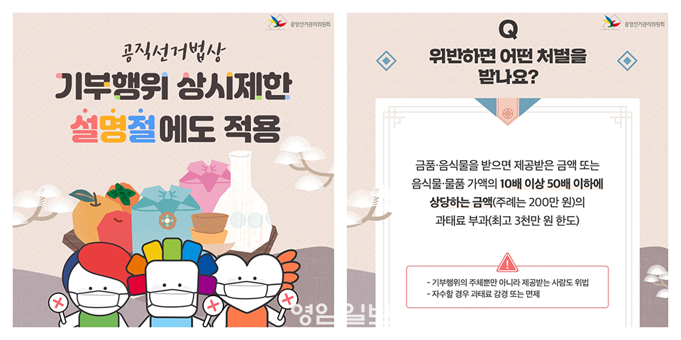 À̹ø ¼³ ¸íÀý¿¡ ÇÒ ¼ö ÀÖ´Â ÇàÀ§·Î´Â ¡ã ¸íÀý µî¿¡ ÀÇ·ÊÀûÀÎ Àλ縻À» ¹®ÀÚ¸Þ½ÃÁö³ª Æ®À§ÅÍ, ÆäÀ̽ººÏ, īī¿ÀÅå µî SNS·Î Àü¼ÛÇÏ´Â ÇàÀ§ ¡ã ¼±°Å¿îµ¿À» ÇÒ ¼ö ÀÖ´Â »ç¶÷ÀÌ ¼±°ÅÀÏÀÌ ¾Æ´Ñ ¶§¿¡ °¢Á¾ Çà»çÀå¿¡¼ Âü¼®ÀÚµé°ú ÀÏÀÏÀÌ ¾Ç¼ö․Àλ縦 ÇÏ¸é¼ ¸»·Î ¼±°Å¿îµ¿À» ÇÏ´Â ÇàÀ§ µîÀÌ ÀÖÀ¸¸ç, ÇÒ ¼ö ¾ø´Â ÇàÀ§·Î´Â ¡ã °ü³» °æ·Î´ç°ú ³ëÀÎÁ¤ µî¿¡ ¸íÀý Àλç¸í¸ñÀ¸·Î °úÀÏ¡¤¼±¹° µîÀ» Á¦°øÇÏ´Â ÇàÀ§ ¡ã ÀÔÈĺ¸¿¹Á¤ÀÚ°¡ ¸íÀýÀλ縦 ºùÀÚÇØ ƯÁ¤ ¼±°Å¿¡ Ã⸶ÇÒ Àǻ縦 ¹àÈ÷¸é¼ ÁöÁö¸¦ ºÎŹÇÏ´Â µî ¼±°Å¿îµ¿ ³»¿ëÀÌ ´ã±ä Çö¼ö¸·À» °Ô½ÃÇϰųª ÀλçÀåÀ» ¹ß¼ÛÇÏ´Â ÇàÀ§ µîÀÌ ÀÖ´Ù.