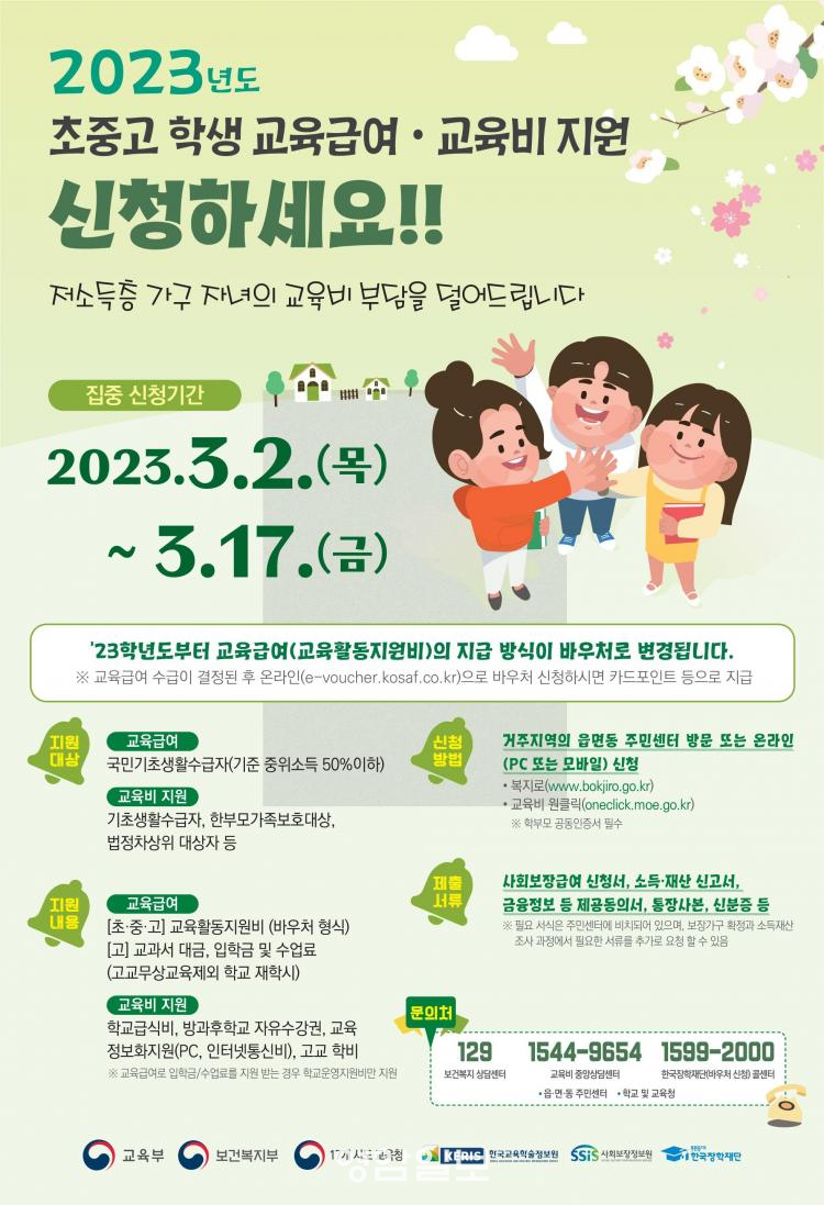±³À°±Þ¿© Áß ±³À°È°µ¿Áö¿øºñÀÇ °æ¿ì 2023³âºÎÅÍ Çö±Ý Áö±ÞÀÌ ¾Æ´Ñ¹Ù¿ìó Áö±Þ¹æ½ÄÀ¸·Î º¯°æ ¿î¿µµÇ¹Ç·Î, ±³À°±Þ¿© Áö¿ø ´ë»óÀÎ ¸¸ 14¼¼ ÀÌ»ó Çлý(Çкθð)Àº À̹ٿìó(e-voucher.kosaf.go.kr)¸¦ ÅëÇØ ¹Ýµå½Ã º°µµÀÇ ¹Ù¿ìó Áö±Þ ½ÅûÀ» ÇØ¾ß ÇÑ´Ù.