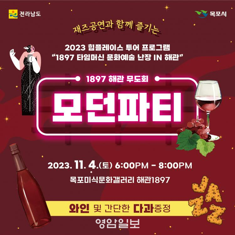 ÇÑÆí, Àü¶ó³²µµ °ø¸ð»ç¾÷À¸·Î ¼±Á¤µÇ¾î ÃßÁøÇÏ´Â 2023 ÈüÇ÷¹À̽º Åõ¾î ÇÁ·Î±×·¥Àº ¸ñÆ÷¹Ì½Ä¹®È°¶·¯¸® ÇØ°ü 1897À» Ȱ¿ëÇÑ Çà»çÀÌ´Ù. 1ȸÂ÷ Çà»ç¿¡´Â ¡®°¡¼ö º¯Áø¼·°ú ´À³¢´Â °¡À» À½¾Çȸ¡¯¸¦ ÁÖÁ¦·Î Åë±âŸ ¹× Ŭ·¡½Ä °ø¿¬ µî 7080¼¼´ë¿¡°Ô Ãß¾ïÀÇ ÀåÀ» ¸¶·ÃÇϰí MZ¼¼´ë¿¡°Ô´Â »õ·Î¿î Ãß¾ïÀ» ¼±»çÇÏ´Â °ø¿¬À» ¼±º¸¿´´Ù.