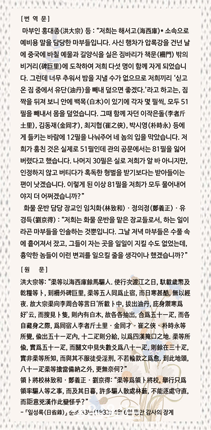 Àǵµ¸¦ ÀǽÉÇÒ ¸¸ÇÑ Á¤È²ÀÌ´Ù. ±×·¡¼ ±×µéÀº Èä¾ÇÇÑ ³ð[ýÔùÓ]ÀÌ µÇ¾î ¸î »ç¶÷Àº ¸Õ °÷À¸·Î ±Í¾çÀ» °¡°í, ÁÖ¹üÀÎ È«´ëÁ¾(ûóÓÞðó)Àº »çÇü´çÇÏ¿´´Ù.