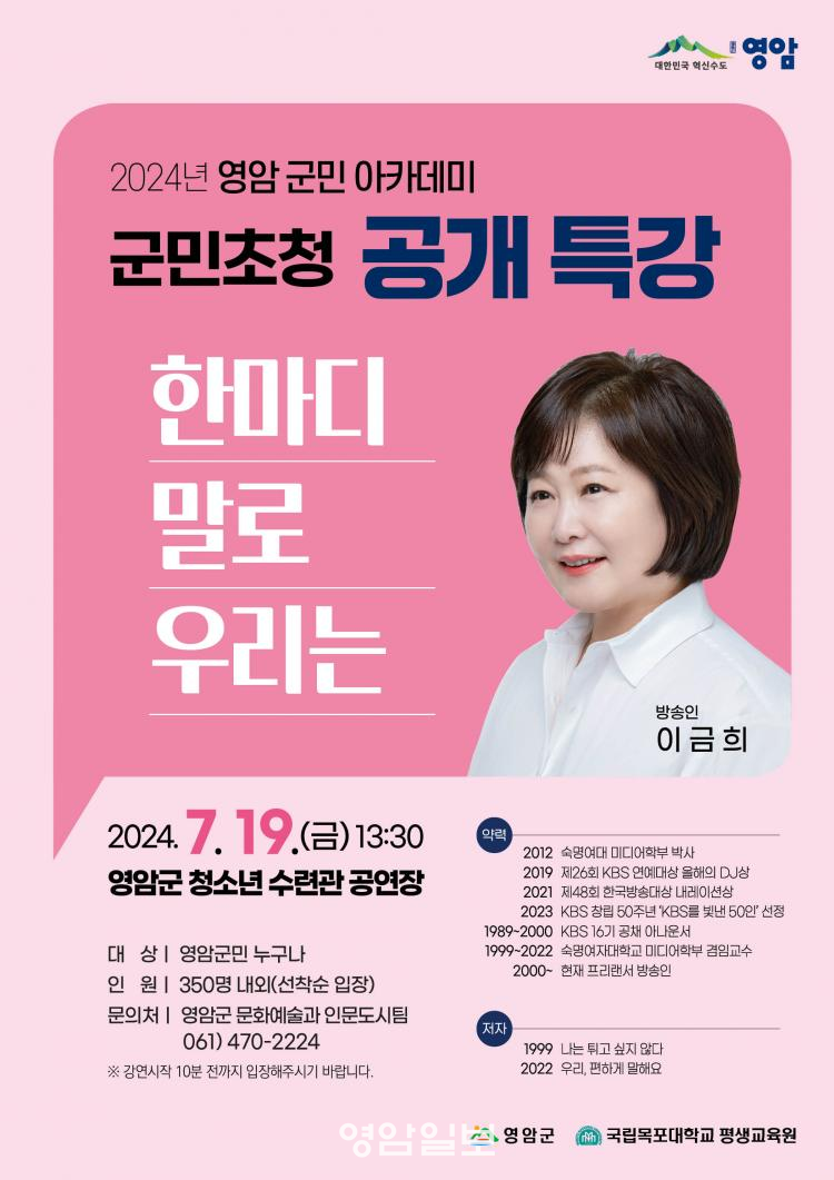 À̳¯ Ư°¿¡¼ ÀÌ ¾Æ³ª¿î¼´Â ¡®ÇѸ¶µð ¸»·Î ¿ì¸®´Â¡¯À» ÁÖÁ¦·Î, 30³â°£ ¹æ¼Û°ú 20³âÀÇ °ÀÇ °æÇèÀ» ¹ÙÅÁÀ¸·Î Àΰ£°ü°è¿¡¼ ¸»°ú ¼ÒÅëÀÇ Á߿伺À» Àü´ÞÇÑ´Ù.